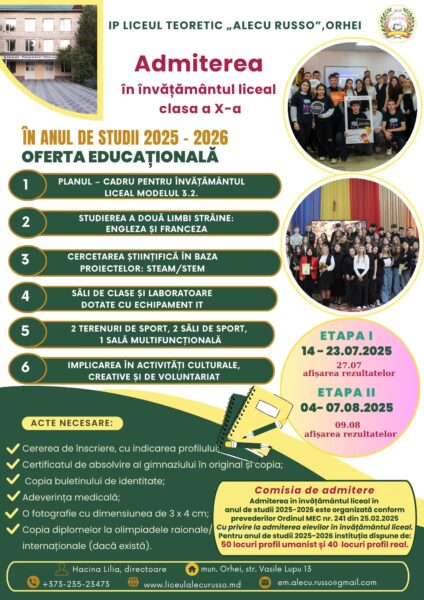 IPLT „Alecu Russo”, Orhei vă informează despre etapele admiterii pentru anul de studii 2025–2026. Vă invităm să deveniți parte a comunității noastre educaționale, unde învățăm cu pasiune, creștem cu încredere și reușim împreună!